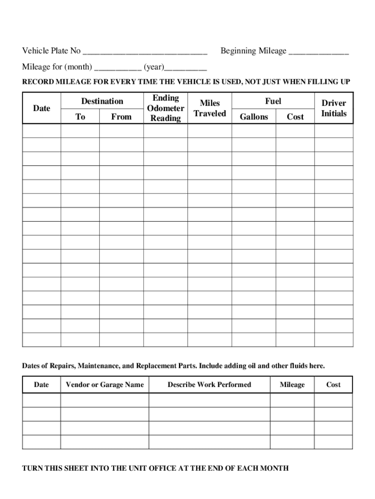 Get the free Vehicle Plate No Beginning Mileage Mileage for (month) ...