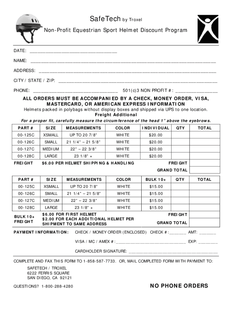 Safety by Trowel Nonprofit Equestrian Sport Helmet Discount Programmable: ___ NAME: ___ ADDRESS: ___ CITY / STATE / ZIP: ___ PHONE: ___501(c)3 NON PROFIT #: ___ALL ORDERS MUST BE ACCOMPANIED BY A
