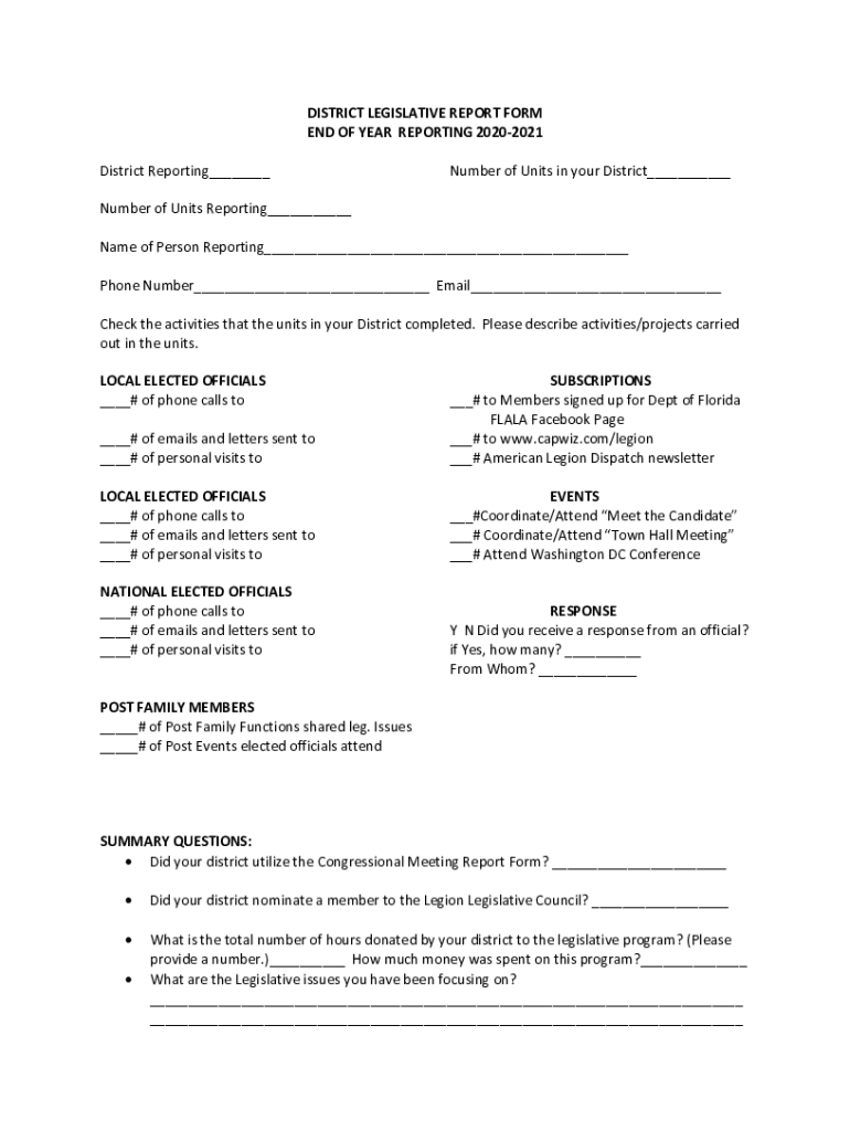 DISTRICT LEGISLATIVE REPORT FORM END OF YEAR REPORTING 20202021 District Reporting___Number of Units in your District___Number of Units Reporting___ Name of Person Reporting___ Phone Number___ Email___