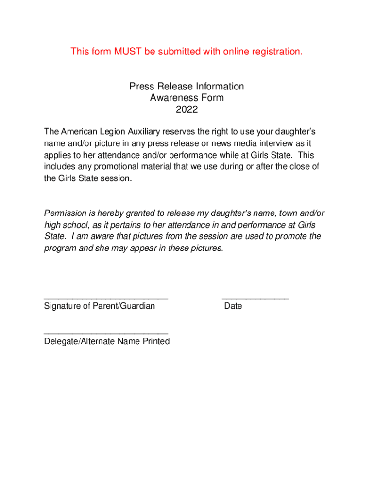 This form MUST be submitted with online registration. Press Release Information Awareness Form 2022 The American Legion Auxiliary reserves the right to use your daughters name and/or picture in any