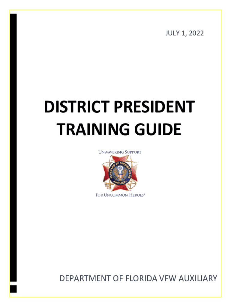 JULY 1, 2022DISTRICT PRESIDENT TRAINING GUIDEDEPARTMENT OF FLORIDA VFW AUXILIARYCongratulations, you have been elected to the highest office in your District! Guidelines have been established to assist