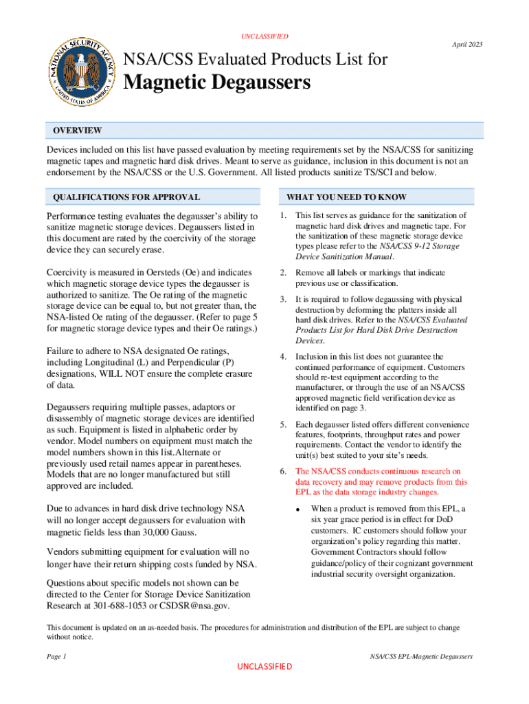 UNCLASSIFIED April 2023NSA/CSS Evaluated Products List nonmagnetic Defaulters OVERVIEWDevices included on this list have passed evaluation by meeting requirements set by the NSA/CSS for sanitizing
