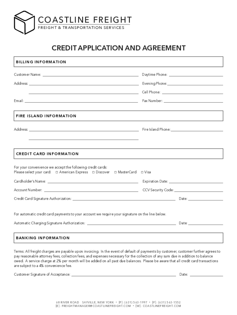 COASTLINE E F R E IG H T FREIGHT & TR AN SORTATION SERVICESCREDIT APPLICATION AND AGREEMENT BILL ING INFORMATION BILLING INFORMATION Customer Name: ___Daytime Phone: ___Address: ___Evening Phone:______Cell