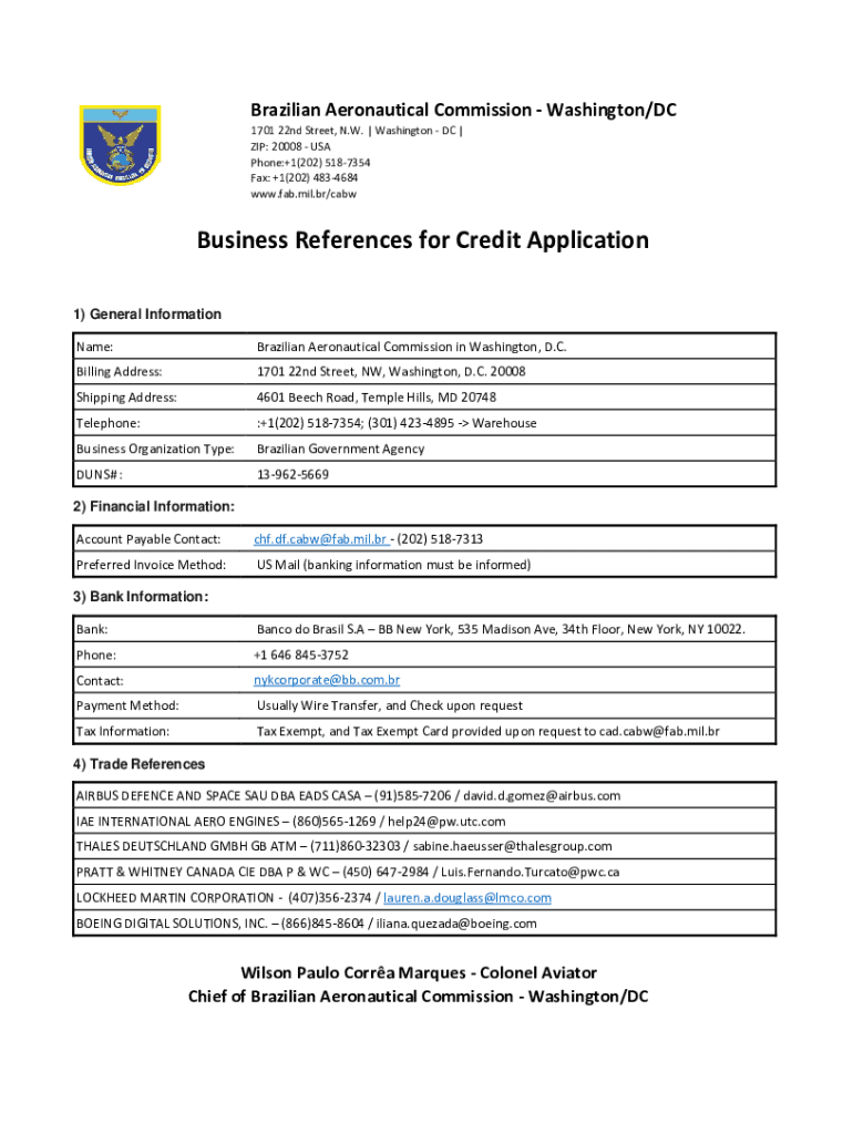 Brazilian Aeronautical Commission Washington/DC 1701 22nd Street, N.W. | Washington DC | ZIP: 20008 USA Phone:+1(202) 5187354 Fax: +1(202) 4834684 www.fab.mil.br/cabwBusiness References for Credit