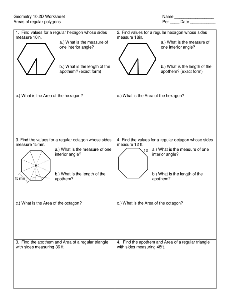 Geometry 10.2D Worksheet Areas of regular polygons 1. Find values for a regular hexagon whose sides measure 10in. a.) What is the measure of one interior angle?b.) What is the length of the apothegm?