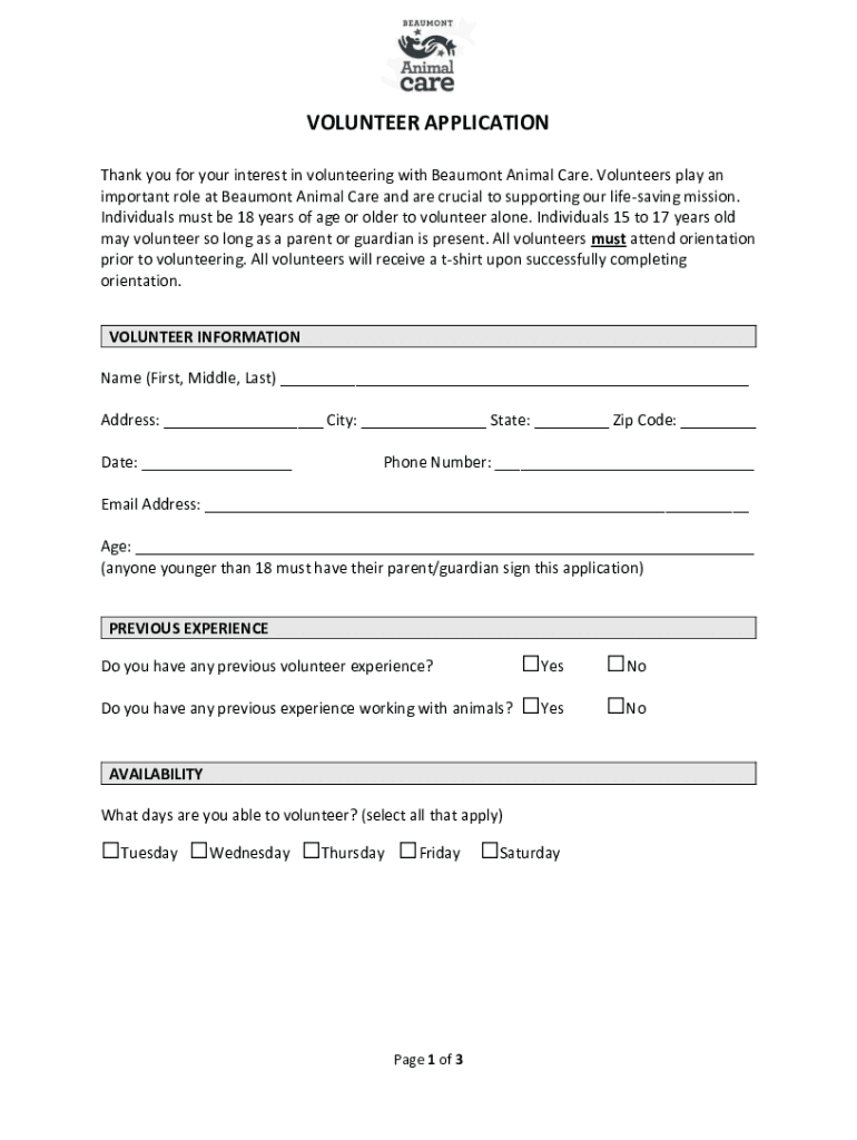 The beaumont animal care volunteer application is a form that individuals fill out to apply for volunteering at the animal care center in Beaumont.