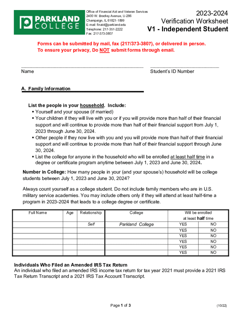 20232024 Verification Worksheet V1 Independent StudentOffice of Financial Aid and Veteran Services 2400 W. Bradley Avenue, U286 Champaign, IL 618211899 Email: finaid@parkland.edu Telephone: 2173512222
