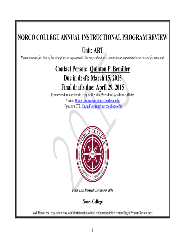 NOR CO COLLEGE ANNUAL INSTRUCTIONAL PROGRAM REVIEW Unit: ART Please give the full title of the discipline or department. You may submit as a discipline or department as is easiest for your noncontact
