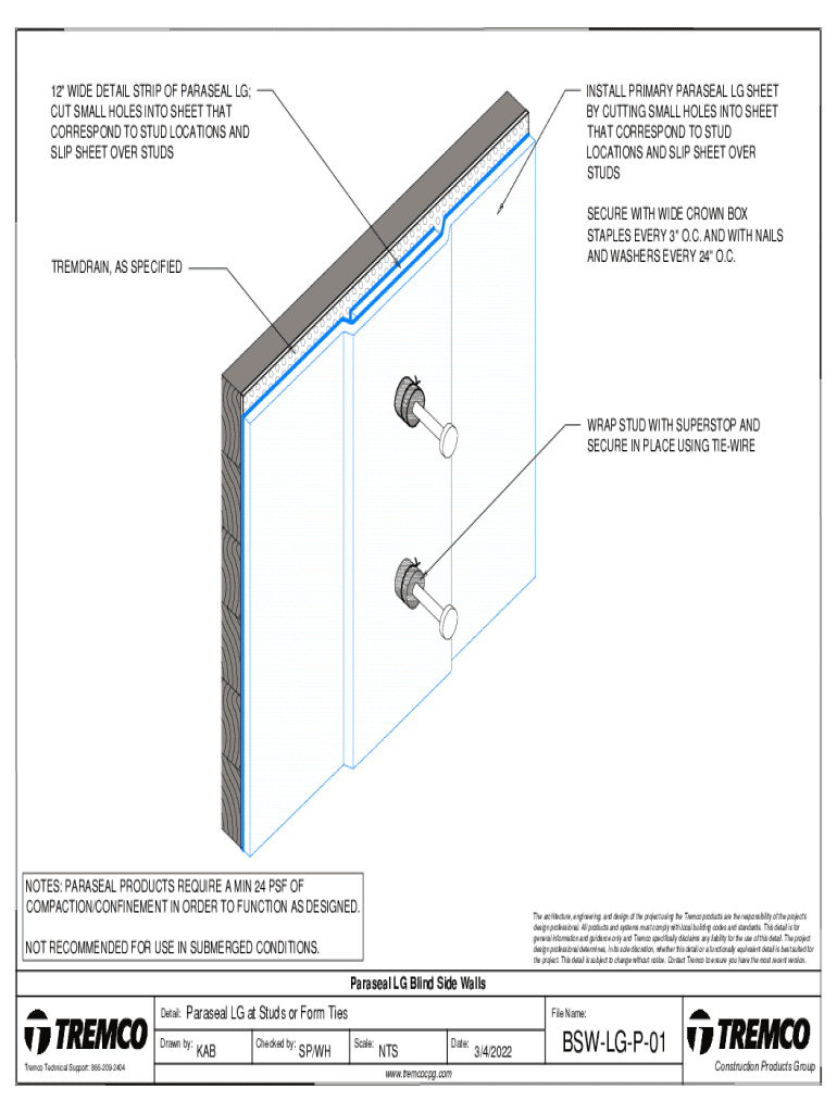 INSTALL PRIMARY PARA SEAL LG SHEET BY CUTTING SMALL HOLES INTO SHEET THAT CORRESPOND TO STUD LOCATIONS AND SLIP SHEET OVER STUDS12\” WIDE DETAIL STRIP OF PARA SEAL LG; CUT SMALL HOLES INTO SHEET