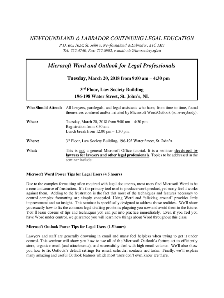 NEWFOUNDLAND & LABRADOR CONTINUING LEGAL EDUCATION P.O. Box 1028, St. Johns, Newfoundland & Labrador, A1C 5M3 Tel: 7224740, Fax: 7228902, email: cle@lawsociety.nf.caMicrosoft Word and Outlook for