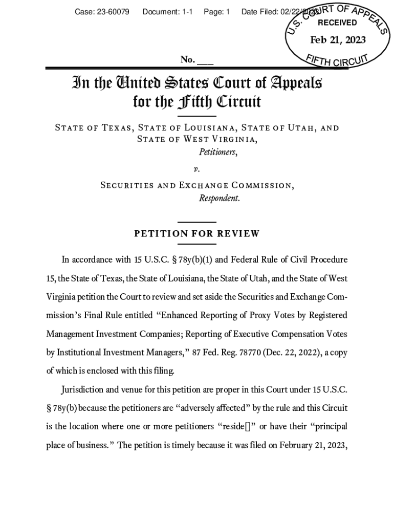 Case: 2360079Document: 11Page: 1Date Filed: 02/22/2023 RECEIVED Feb 21, 2023 No. ___In the United States Court of Appeals for the Fifth Circuit State of Texas, State of Louisiana, State of Utah, and