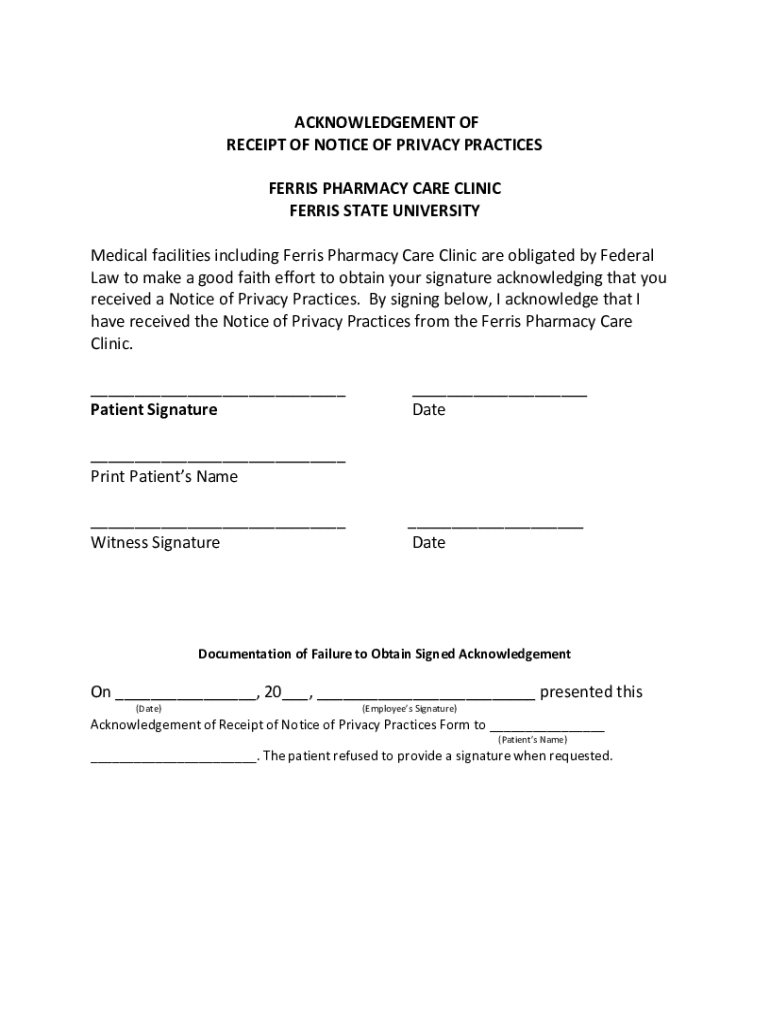 ACKNOWLEDGEMENT OF RECEIPT OF NOTICE OF PRIVACY PRACTICES FERRIS PHARMACY CARE CLINIC FERRIS STATE UNIVERSITY Medical facilities including Ferris Pharmacy Care Clinic are obligated by Federal Law