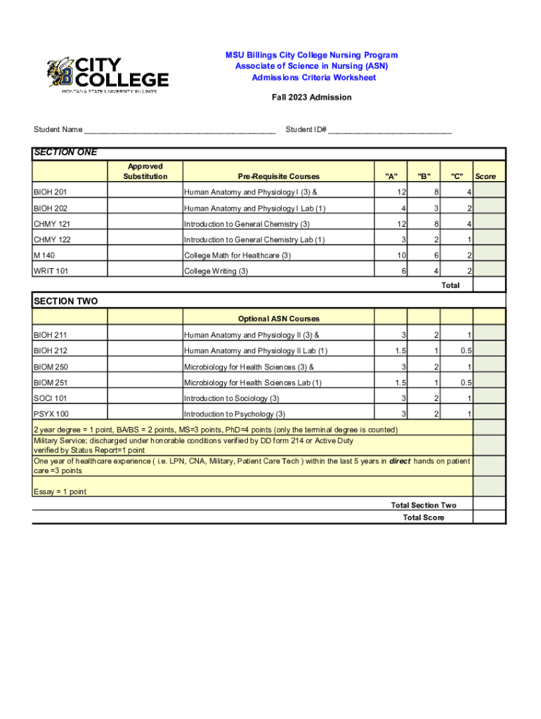 MSU Billings City College Nursing Program Associate of Science in Nursing (ASN) Admissions Criteria Worksheet Fall 2023 Admission Student Name ___Student ID# ___SECTION ONE Approved SubstitutionPreRequisite