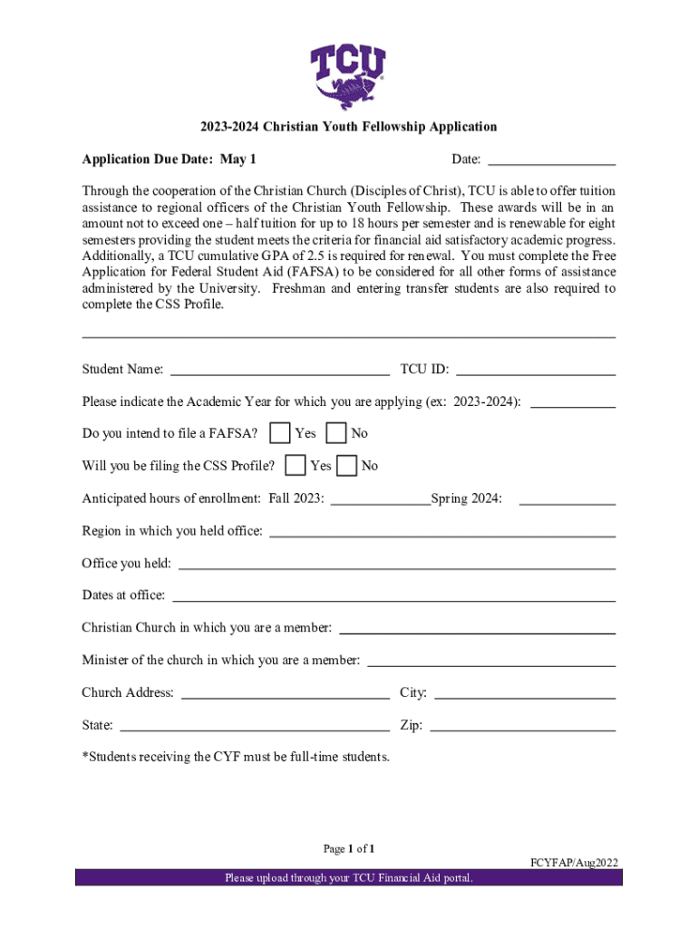 20232024 Christian Youth Fellowship Application Due Date: May 1Date:Through the cooperation of the Christian Church (Disciples of Christ), TCU is able to offer tuition assistance to regional officers