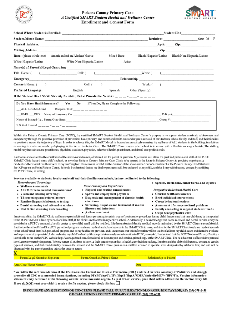 Pickens County Primary Care A Certified SMART Student Health and Wellness Center Enrollment and Consent Form School Where Student is Enrolled: ___Student ID #___ Student/Minor Name: ___ Birthdate: