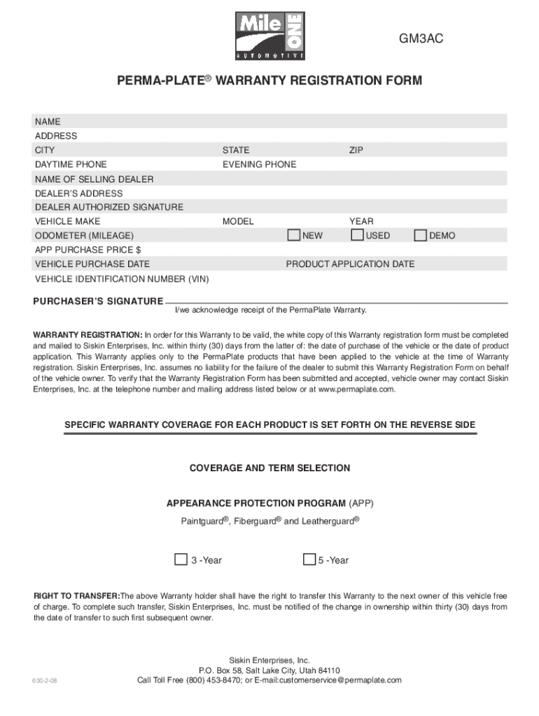 GM3AC TEMPLATE WARRANTY REGISTRATION FORM NAME ADDRESS CITYSTATEZIPDAYTIME PHONEEVENING PHONEME OF SELLING DEALER DEALERS ADDRESS DEALER AUTHORIZED SIGNATURE VEHICLE MAKEMODELODOMETER (MILEAGE)YEAR