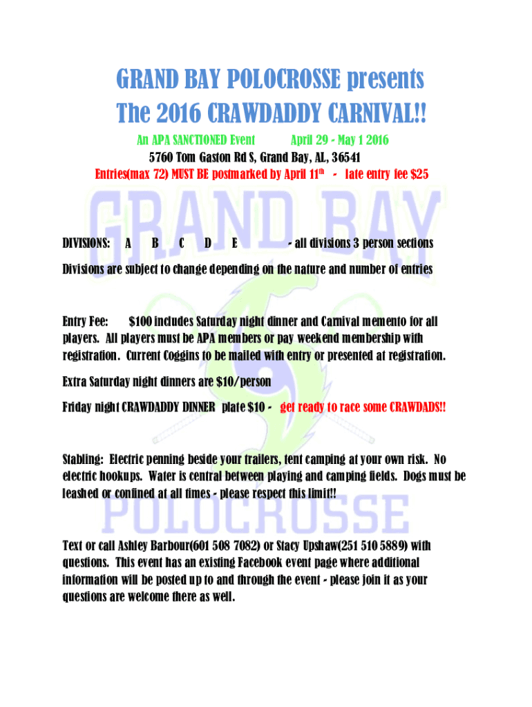 GRAND BAY LACROSSE presents The 2016 CRAWDAD CARNIVAL!! An APA SANCTIONED Event April 29 May 1, 2016 5760 Tom Gaston Rd S, Grand Bay, AL, 36541 Entries(max 72) MUST BE postmarked by April 11th late