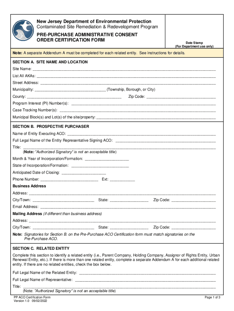 New Jersey Department of Environmental Protection Contaminated Site Remediation & Redevelopment Program PREPURCHASE ADMINISTRATIVE CONSENT ORDER CERTIFICATION Format Stamp (For Department use only)Note: