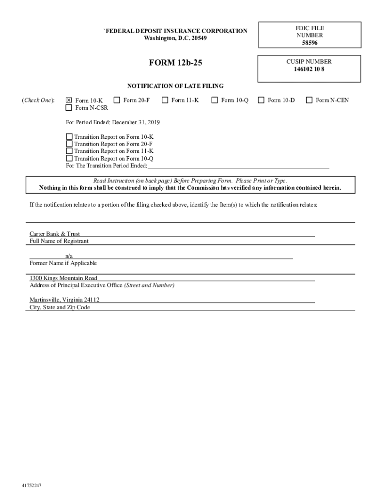 `FEDERAL DEPOSIT INSURANCE CORPORATION Washington, D.C. 20549FDIC FILE NUMBER 58596FORM 12b25CUSIP NUMBER 146102 10 8NOTIFICATION OF LATE FILING (Check One): Form 10KForm 20FForm 11KForm 10QForm 10DForm