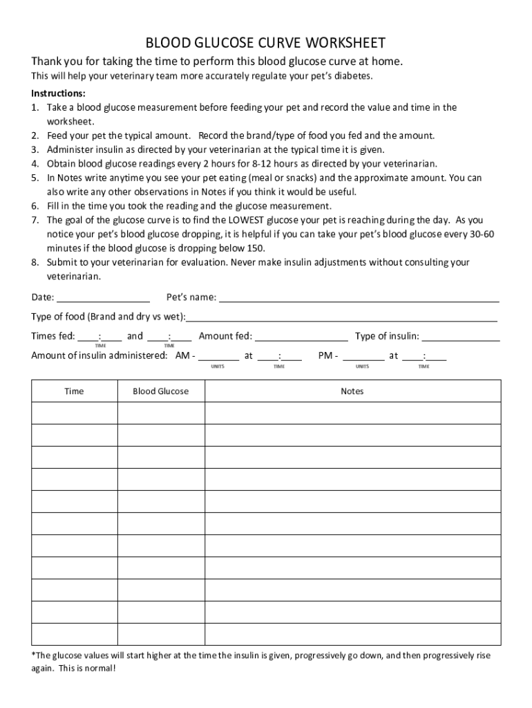 BLOOD GLUCOSE CURVE WORKSHEET Thank you for taking the time to perform this blood glucose curve at home. This will help your veterinary team more accurately regulate your pets diabetes. Instructions: