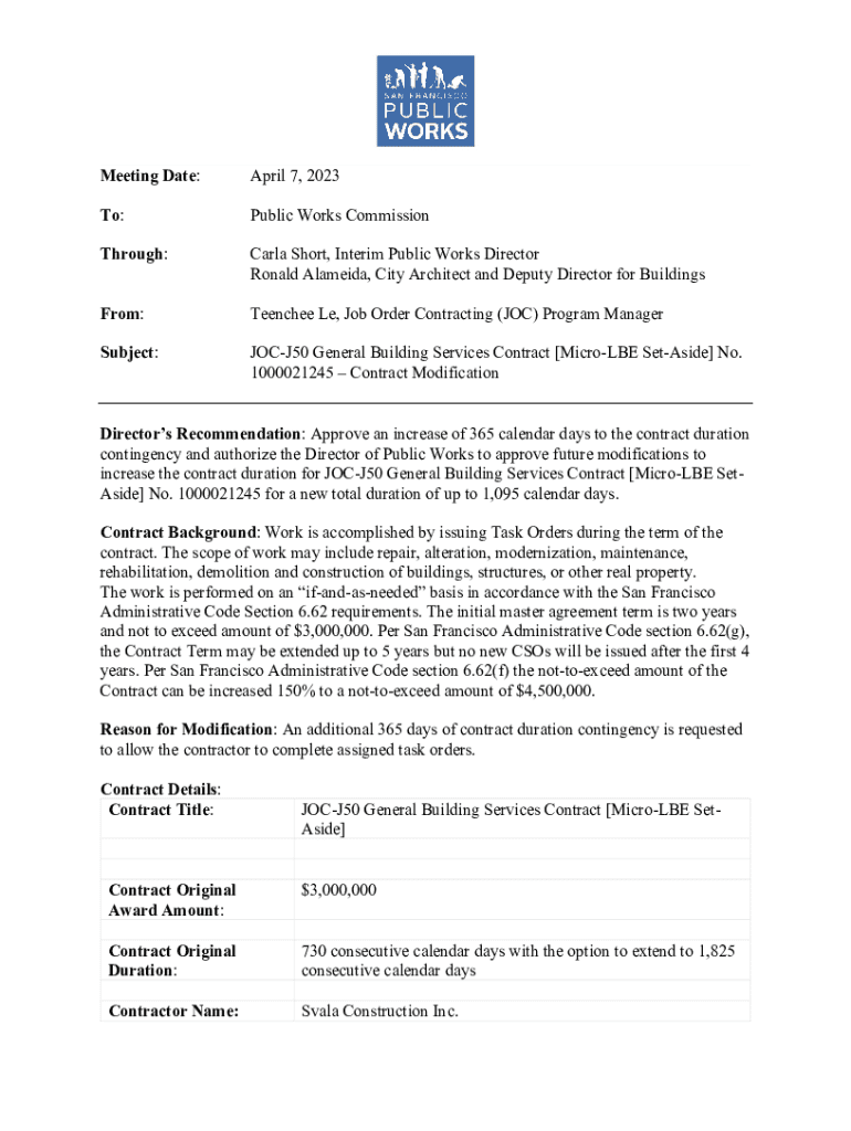 Meeting Date:April 7, 2023To:Public Works CommissionThrough:Carla Short, Interim Public Works Director Ronald Alameda, City Architect and Deputy Director for BuildingsFrom:Trenches Le, Job Order Contracting