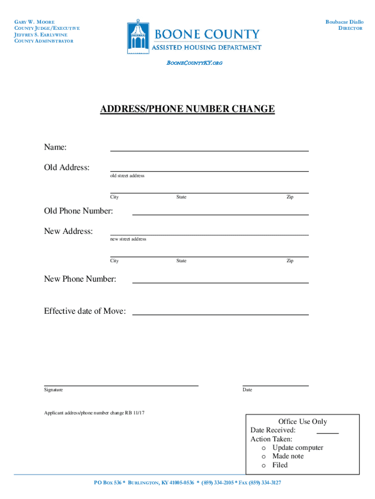 COUNTY ADMINISTRATOR BOONE C COUNTRY. READDRESS/PHONE NUMBER Changeable: