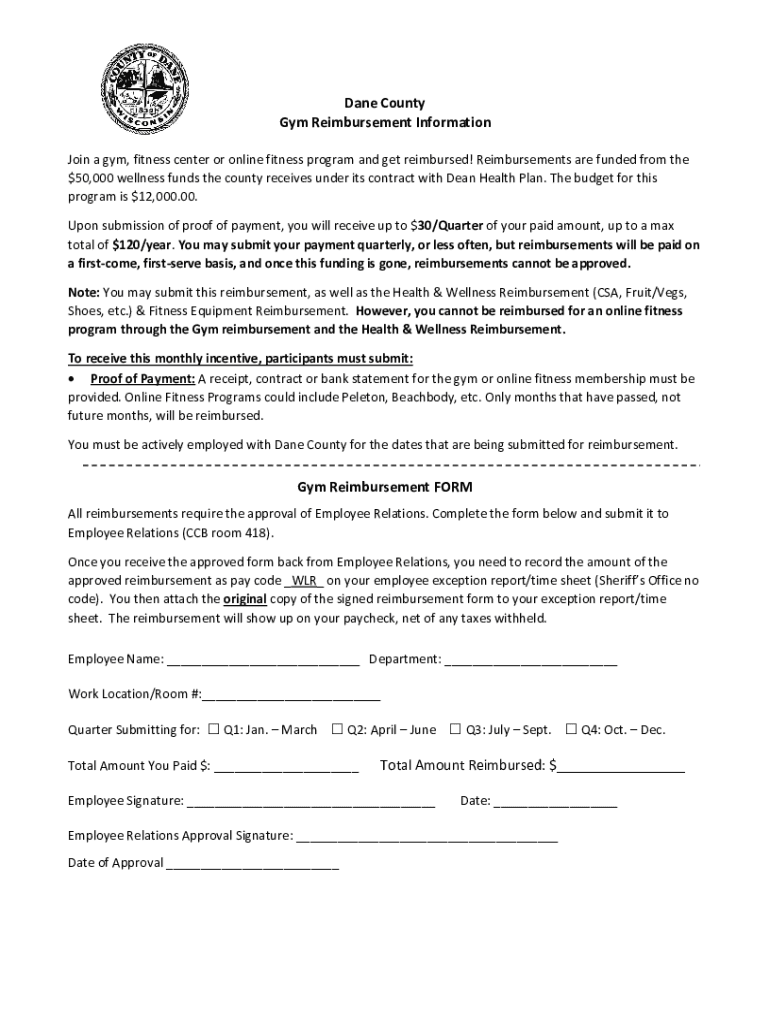 Dane County Gym Reimbursement Information Join a gym, fitness center or online fitness program and get reimbursed! Reimbursements are funded from the $50,000 wellness funds the county receives under