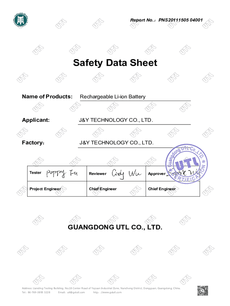Report No.PNS20111505 04001Safety Data Sheet Name of Products:Rechargeable Lion BatteryApplicant:J&Y TECHNOLOGY CO., LTD. Factory TECHNOLOGY CO., LTD. TesterReviewerApproverProject EngineerChief EngineerGUANGDONG