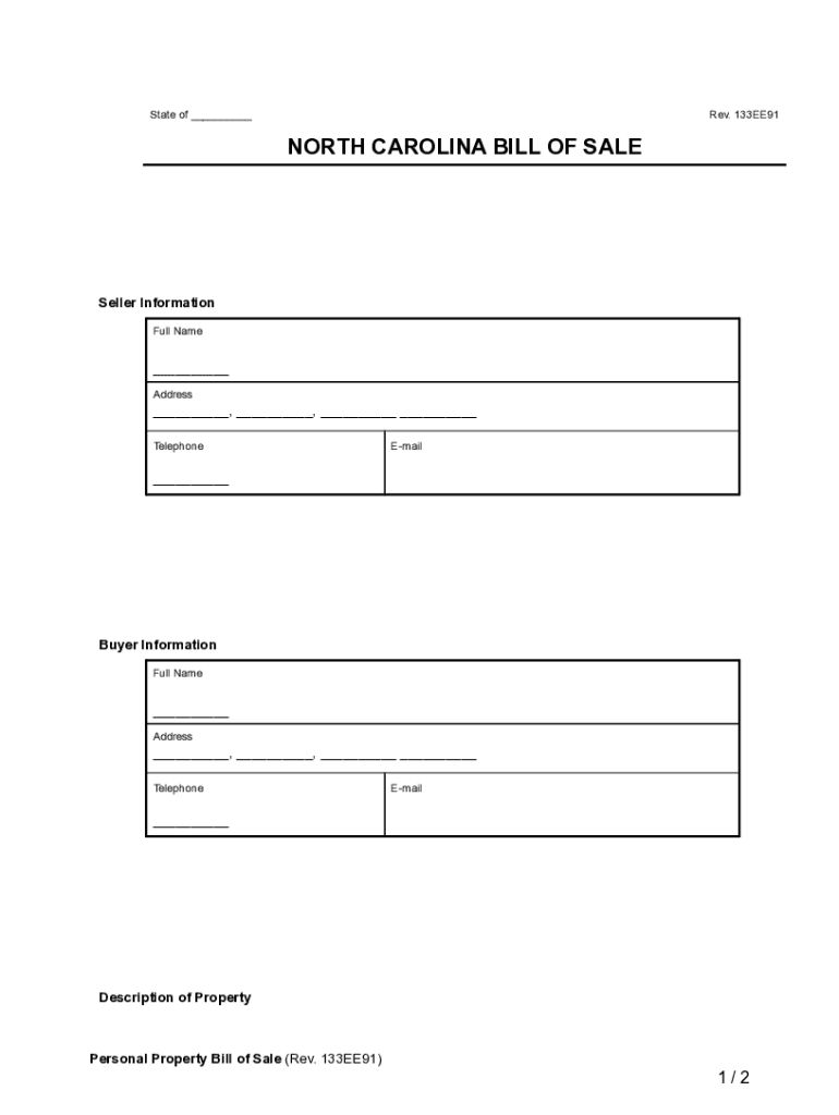 Rev. 133EE91NORTH CAROLINA BILL OF Reseller Information Full Name___ Address___, ___, ___ ___ TelephoneEmail___Buyer Information Full Name___ Address___, ___, ___ ___ TelephoneEmail___Description