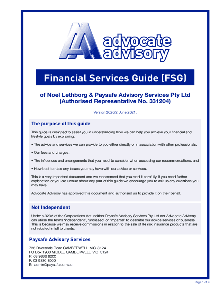 Financial Services Guide (FSG) of Noel Plethora & Pay safe Advisory Services Pty Ltd (Authorized Representative No. 331204) Version 2020/2 June 2021. The purpose of this guide is designed to assist