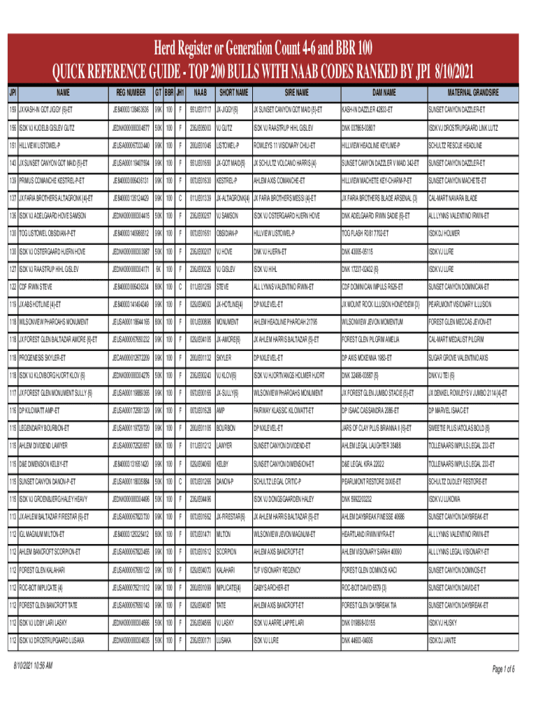 Herd Register or Generation Count 46 and BBR 100 QUICK REFERENCE GUIDE TOP 200 BULLS WITH SAAB CODES RANKED BY CPI 8/10/2021 JPINAMEREG NUMBER GT BBR JH1NAABSHORT NAMES IRE NAMED AM NANOMATERIAL GRANDSIRE159