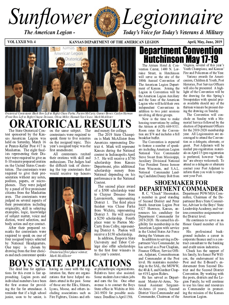 Sunflower The American Legion VOL LXII NO. 4LegionnaireTodays Voice for Today's Veterans & MilitaryKANSAS DEPARTMENT OF THE AMERICAN LEGION April, May, June, 2019Department Convention Hutchinson May