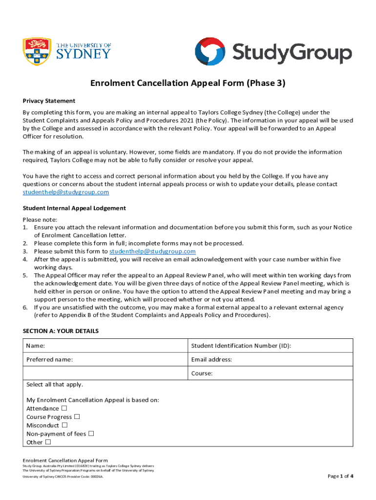 Enrollment Cancellation Appeal Form (Phase 3) Privacy Statement By completing this form, you are making an internal appeal to Taylor's College Sydney (the College) under the Student Complaints and