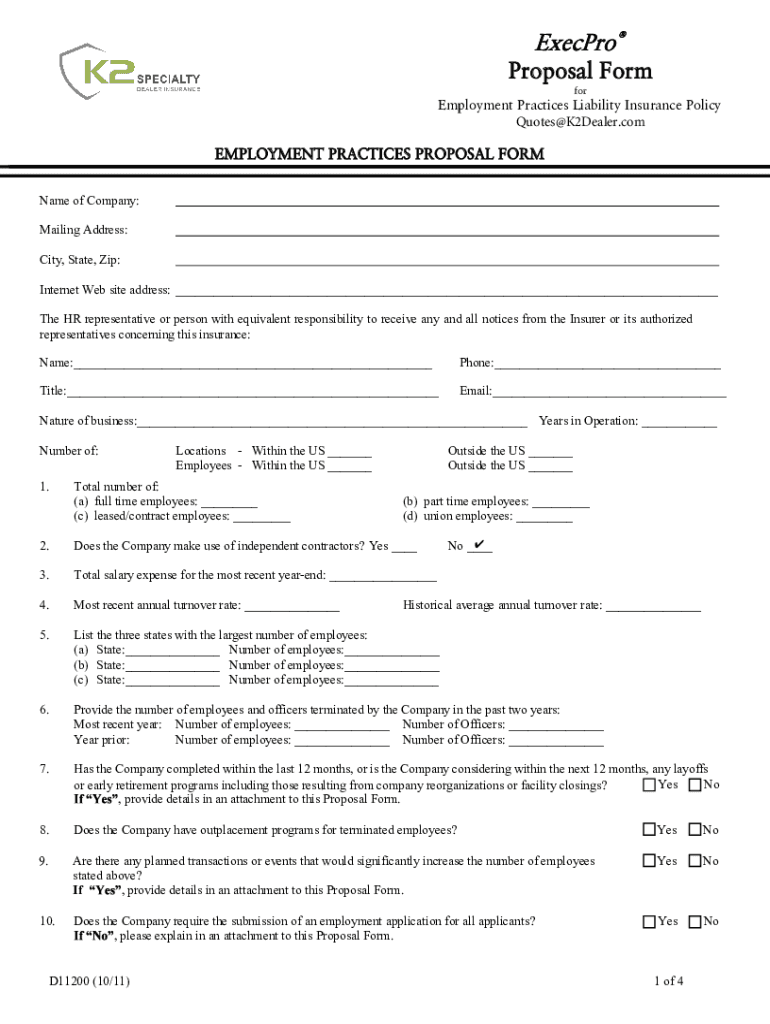 Proposal Form employment Practices Liability Insurance Policy Quotes@K2Dealer.comEMPLOYMENT PRACTICES PROPOSAL FORM Name of Company: Mailing Address: City, State, Zip: Internet Website address: ___
