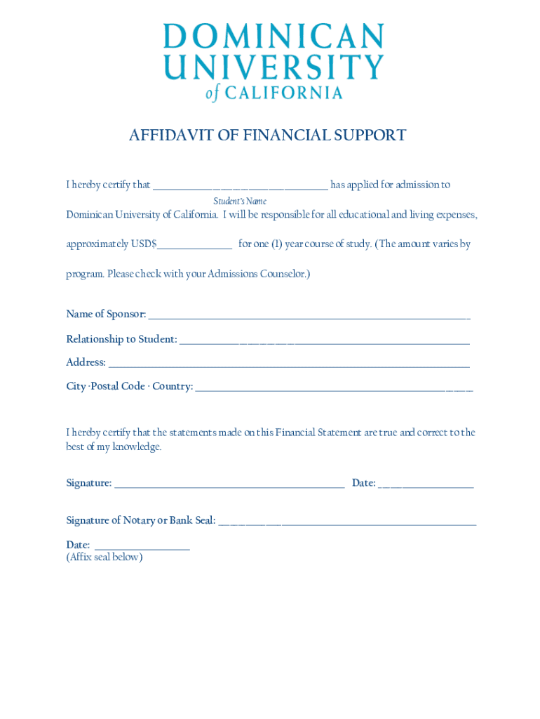 AFFIDAVIT OF FINANCIAL SUPPORT I hereby certify that ___ has applied for admission to Students Name Dominican University of California. I will be responsible for all educational and living expenses,