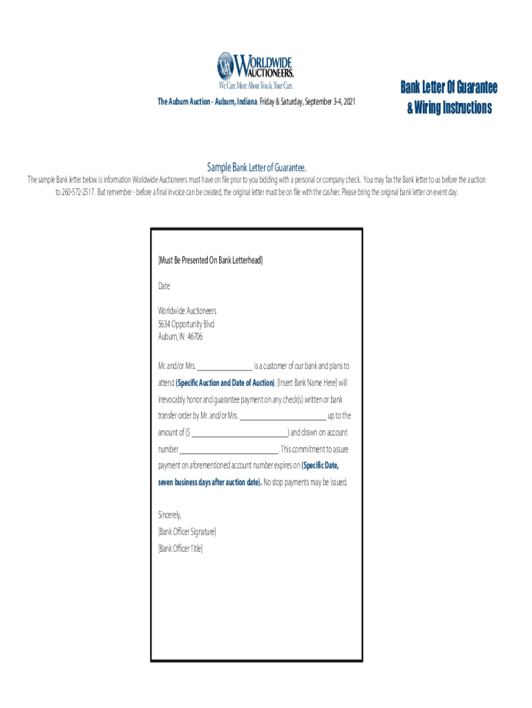 We Care More About You & Your Cars. The Auburn Auction Auburn, Indiana. Friday & Saturday, September 34, 2021Sample Bank Letter of Guarantee. Bank Letter Of Guarantee & Wiring Instructions sample
