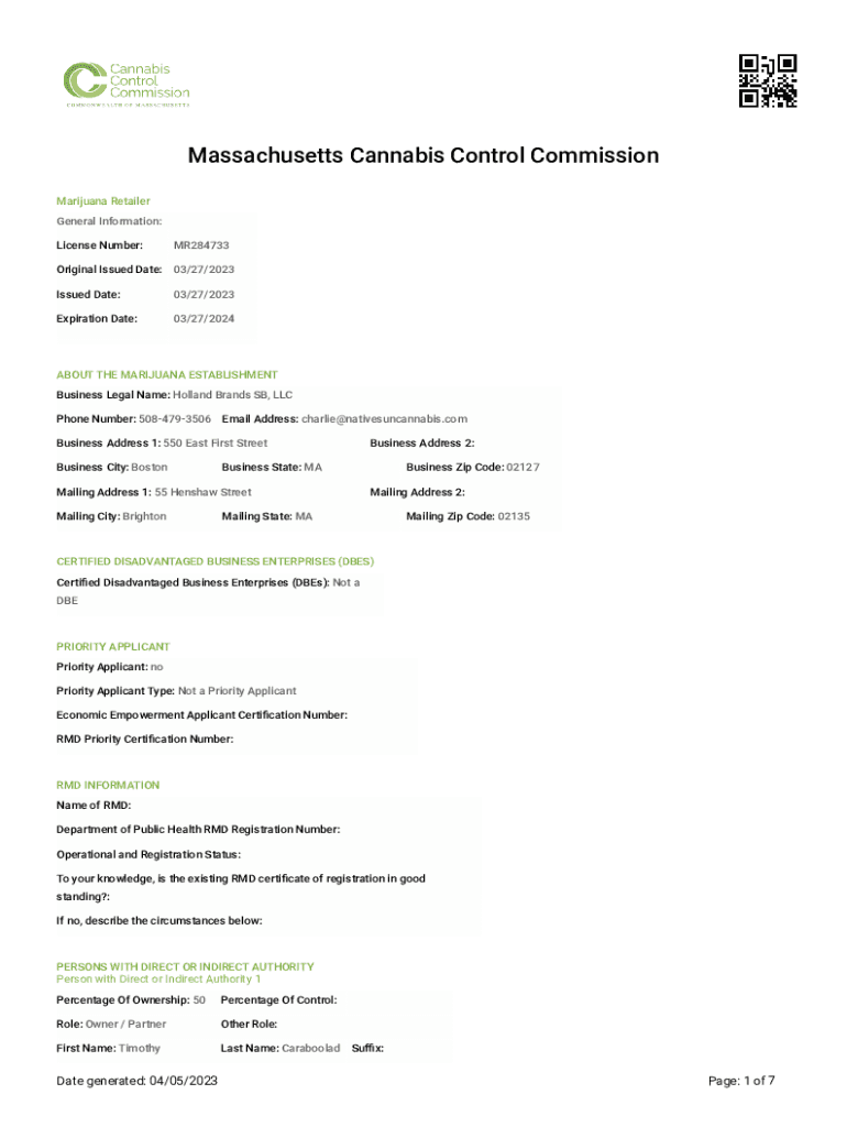 Massachusetts Cannabis Control Commission Marijuana Retailer General Information: License Number:MR284733Original Issued Date: 03/27/2023 Issued Date:03/27/2023Expiration Date:03/27/2024ABOUT THE