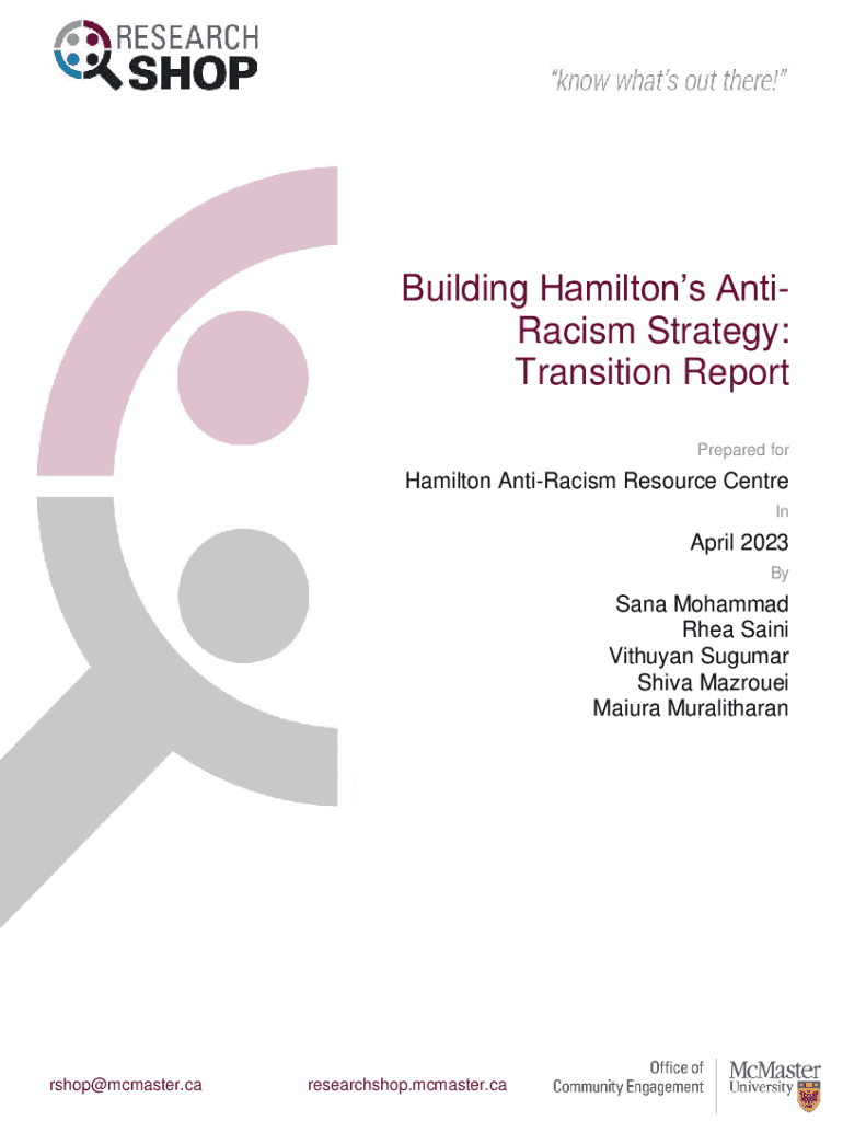 Building Hamilton's AntiRacism Strategy: Transition Report Prepared for Hamilton AntiRacism Resource Center In April 2023 By Sana Mohammad Rhea Saint Sichuan Sugar Shiva Marque Maura Muralitharanrshop@mcmaster.caresearchshop.mcmaster.caTable