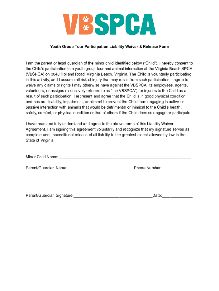 Youth Group Tour Participation Liability Waiver & Release Form am the parent or legal guardian of the minor child identified below (Child). I hereby consent to the Child's participation in a youth