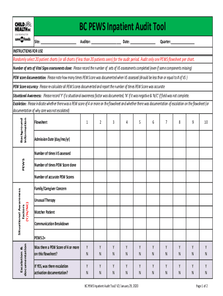 BC PEWS Inpatient Audit Tool Site: ___Auditor: ___ Date: ___Quarter:___INSTRUCTIONS FOR Randomly select 20 patient charts (or all charts if less than 20 patients seen) for the audit period. Audit