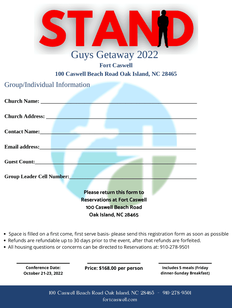 Guys Getaway 2022 Fort Ca swell 100 Ca swell Beach Road Oak Island, NC 28465Group/Individual Information Church Name: ___ Church Address: ___ Contact Name:___ Email address:___ Guest Count:___ Group