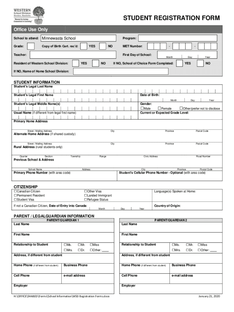 STUDENT REGISTRATION FORM Office Use Only School to attend:Minnesota Schoolmate:Copy of Birth Cert. Recd:Program: GENOME Number:Teacher:First Day of School:Resident of Western School Division:YESNOMonthDayIf