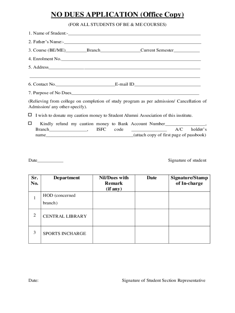 NO DUES APPLICATION (Office Copy) (FOR ALL STUDENTS OF BE & ME COURSES) 1. Name of Student:___ 2. Fathers Name:___ 3. Course (BE/ME)___Branch___Current Semester___ 4. Enrollment No.___ 5. Address___