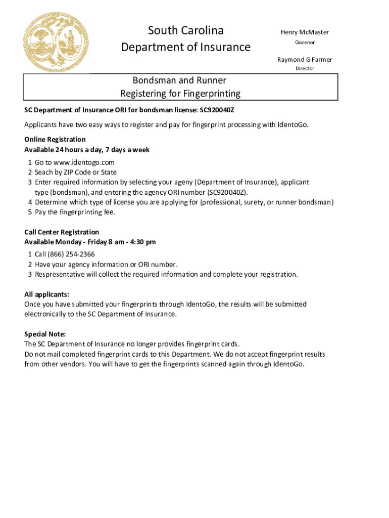 Individuals seeking employment or licensure within the insurance industry are typically required to file fingerprinting department of insurance sc.