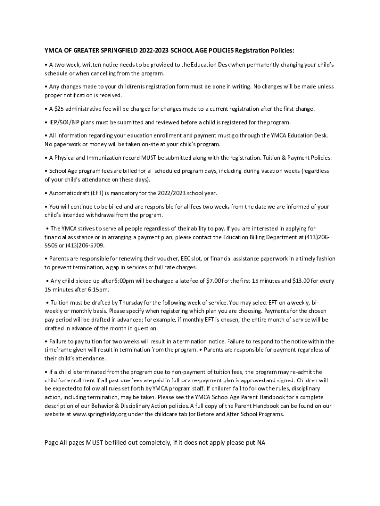 YMCA OF GREATER SPRINGFIELD 20222023 SCHOOL AGE POLICIES Registration Policies: A two week, written notice needs to be provided to the Education Desk when permanently changing your children schedule