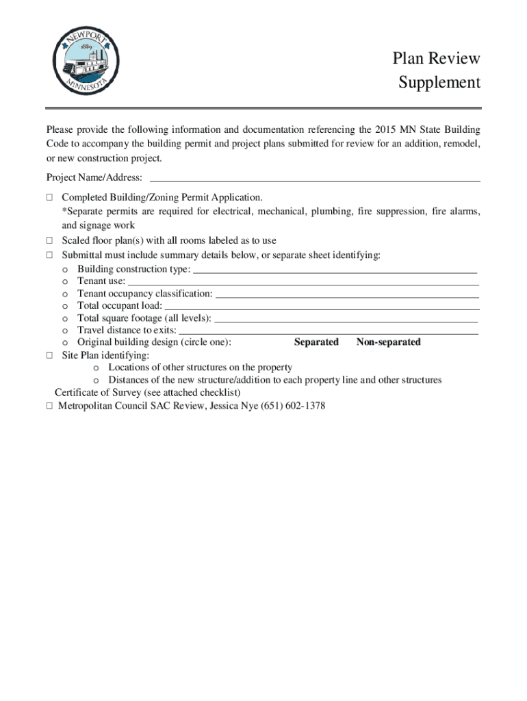Plan Review Supplement Please provide the following information and documentation referencing the 2015 MN State Building Code to accompany the building permit and project plans submitted for review