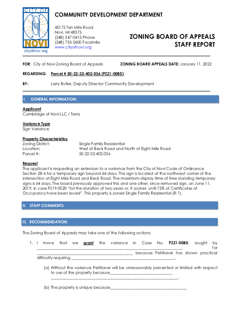 COMMUNITY DEVELOPMENT DEPARTMENT 45175 Ten Mile Road Nova, MI 48375 (248) 3470415 Phone (248) 7355600 Facsimile www.cityofnovi.orgZONING BOARD OF APPEALS STAFF REPORT___ FOR: City of Nova Zoning Board