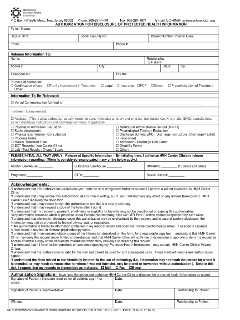 P O Box 147 Belle Mead, New Jersey 08502Phone: 9082811479Fax: 9082811671Email: CCHIM@hackensackmeridian.orgAUTHORIZATION FOR DISCLOSURE OF PROTECTED HEALTH INFORMATION Patient Name: Date of Birth:Social