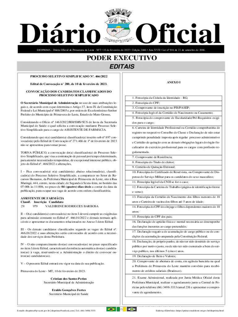 Obtenha o gratuito DIOPRIMA - Dirio Ocial de Primavera do Leste - MT 10 de fevereiro de 2023 Edio...