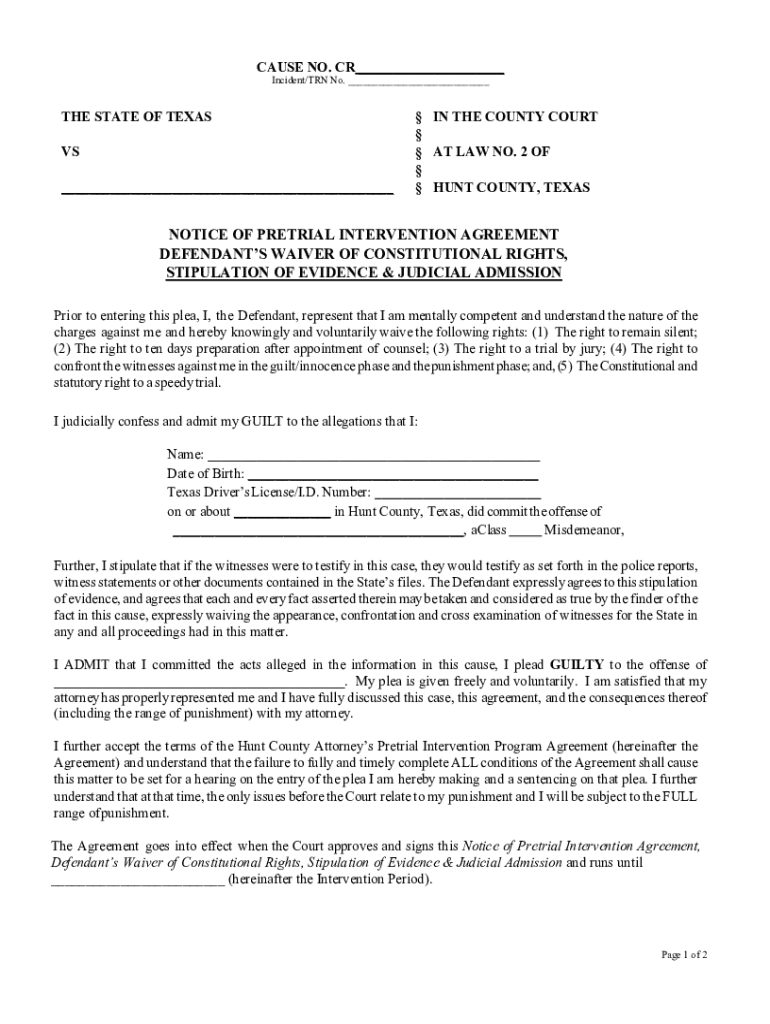 CAUSE NO. CR ___ Incident/TEN No. ___THE STATE OF TEXAS VS ___ IN THE COUNTY COURT AT LAW NO. 2 OF HUNT COUNTY, TEXASNOTICE OF PRETRIAL INTERVENTION AGREEMENT DEFENDANTS WAIVER OF CONSTITUTIONAL RIGHTS,